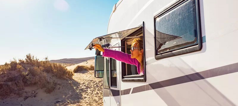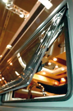 Fenster ohne Rahmen: Rahmenlose Fenster erkennen Sie daran, dass das Fenster außen an der Fahrzeugwand auf einer Gummidichtung aufliegt. Der angedeutete und nur rein optische Rahmen ist auf das Acrylglas auflackiert. – oftmals gepunktet.