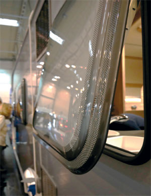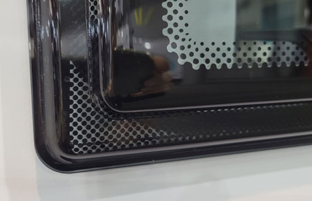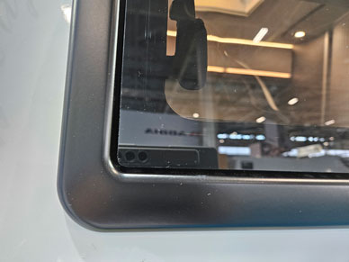 Fenster ohne Rahmen: Rahmenlose Fenster erkennen Sie daran, dass das Fenster außen an der Fahrzeugwand auf einer Gummidichtung aufliegt. Der angedeutete und nur rein optische Rahmen ist auf das Acrylglas auflackiert. – oftmals gepunktet.